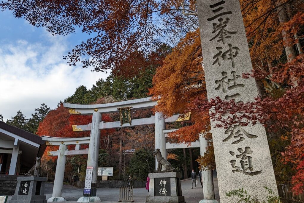 三峯神社の境内の入口は全国でも珍しい三ツ鳥居です。三ツ鳥居とともに2匹のオオカミが出迎えてくれます。