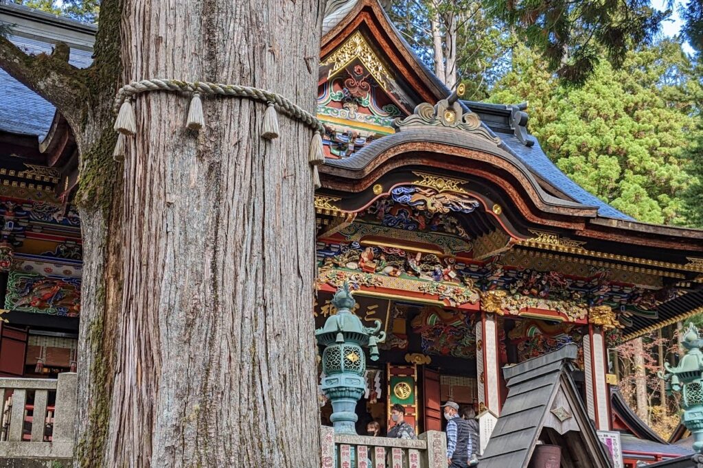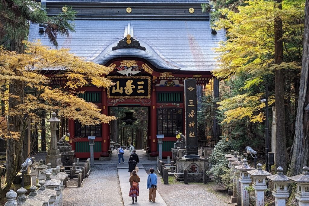 三ツ鳥居を通り、本殿に向かって歩いて行くと次にあるのが随身門です。美しい随身門と拝殿は、三峯神社の代表的な見どころです。