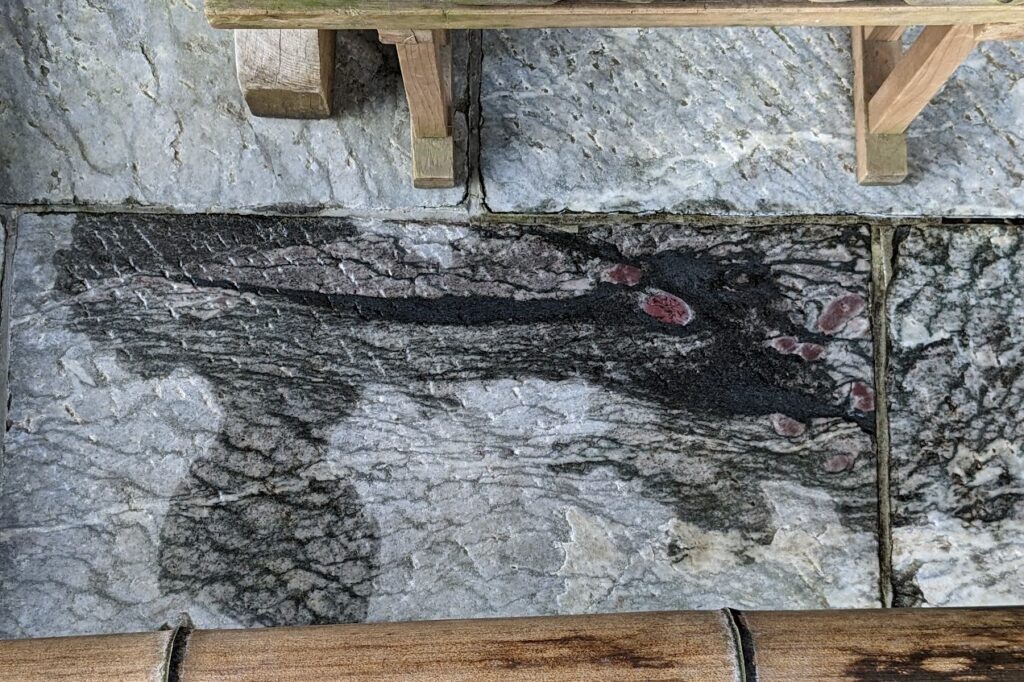 拝殿と龍 拝殿の美しさも際立っており、その前には平成24年の辰年に浮かび上がった龍が祀られています。この龍はスマホの待ち受けにするとパワーを感じると言われています。