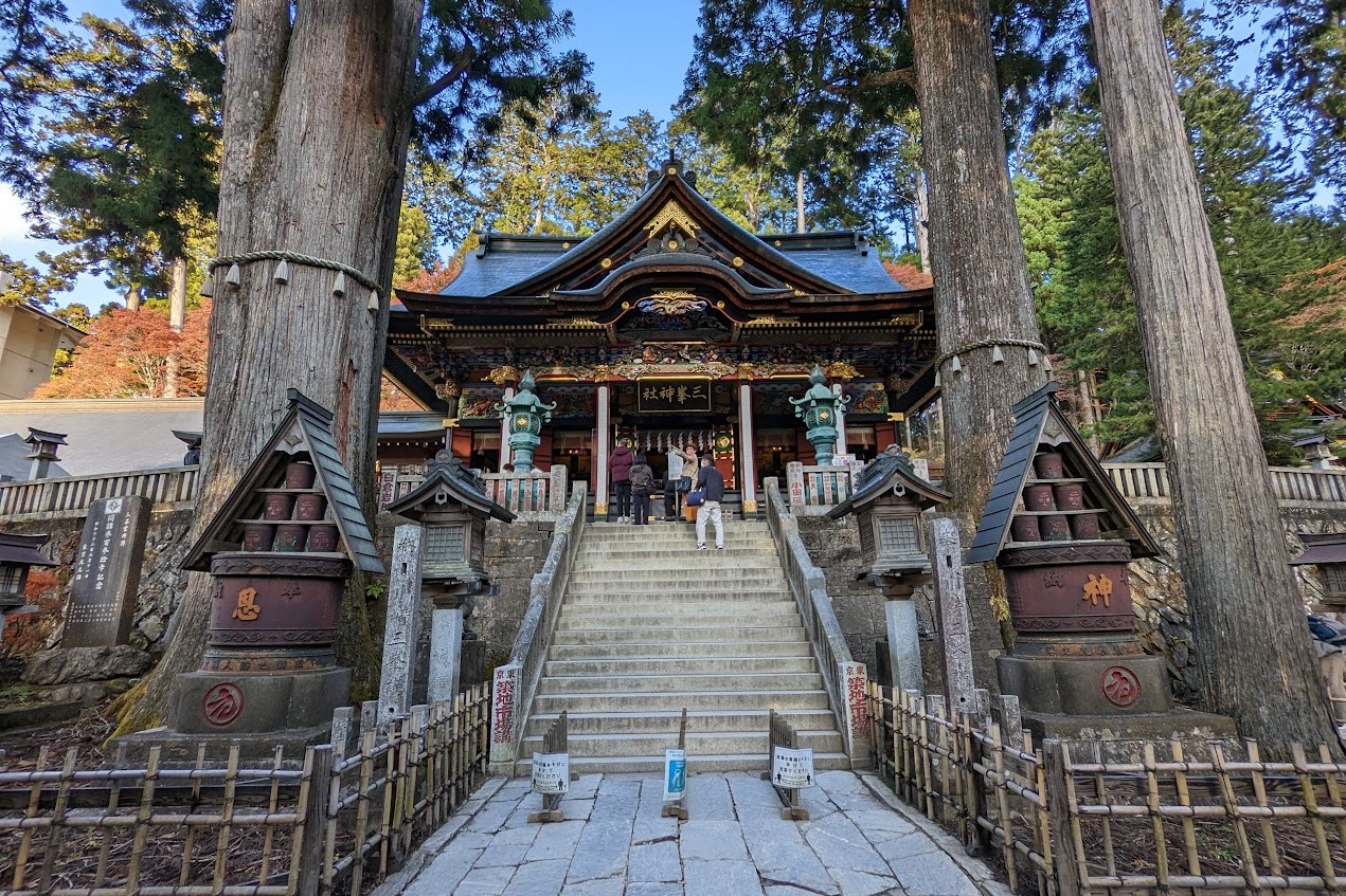 三ツ鳥居を通り、本殿に向かって歩いて行くと次にあるのが随身門です。美しい随身門と拝殿は、三峯神社の代表的な見どころです。